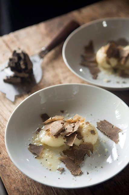 Coloque um pouco de parmigiano reggiano ralado no fundo do prato, posicione um ou dois nhoques sobre, salpique com um pouco mais de parmigiano reggiano ralado, coloque uma ou duas colheres de manteiga noisette sobre os nhoques e, em seguida, finalize com raspas de tartufo negro.