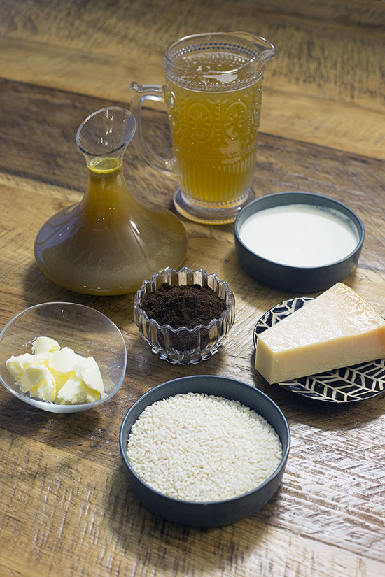 Se quiser impressionar seus convidados, use um prato próprio para risoto. Coloque uma porção no meio e, batendo em baixo, faça com que o arroz se espalhe pela superfície mais funda do prato. Com a ajuda de uma colher, espalhe um pouco do creme de Grana Padano DOP sobre a superfície do arroz, mas sem tocá-lo. Em seguida, adicione algumas pitadas de pó de café, que serve para ativar as papilas degustativas, fazendo com que sua experiência gastronômica seja bem mais intensa. Finalize com a redução de cerveja, num movimento de espiral de dentro para fora.