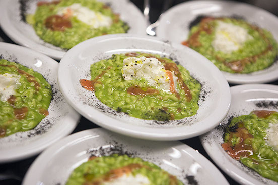 A receita proposta a seguir, assinada pelo Chef 3 estrelas Michelin, Roberto Cerea, do restaurante Da Vittorio (Bergamo – Itália), recomenda o uso de arroz Carnaroli e combina ao risoto outro sabor característico do norte da Itália e, mais especificamente, da Ligúria. Trata-se do pesto, cuja figura é indissociável da culinária genovesa, porém numa versão mais suave, que não leva alho.